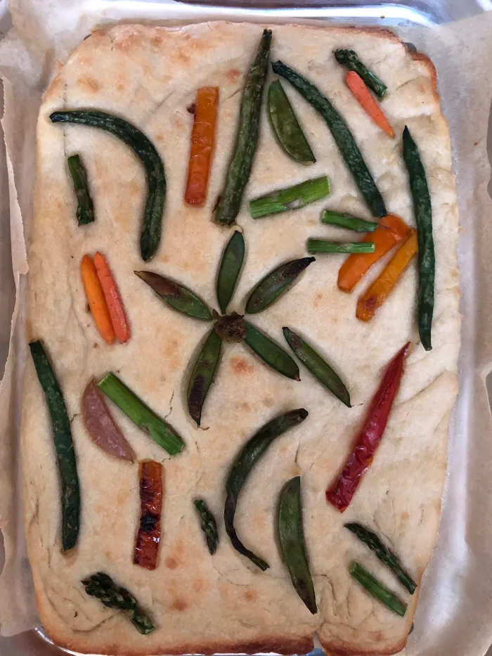 6. Top with pizza sauce, cheese or favorite toppings (if making a pizza – I used roasted vegetables), or top with dried rosemary if making a focaccia.